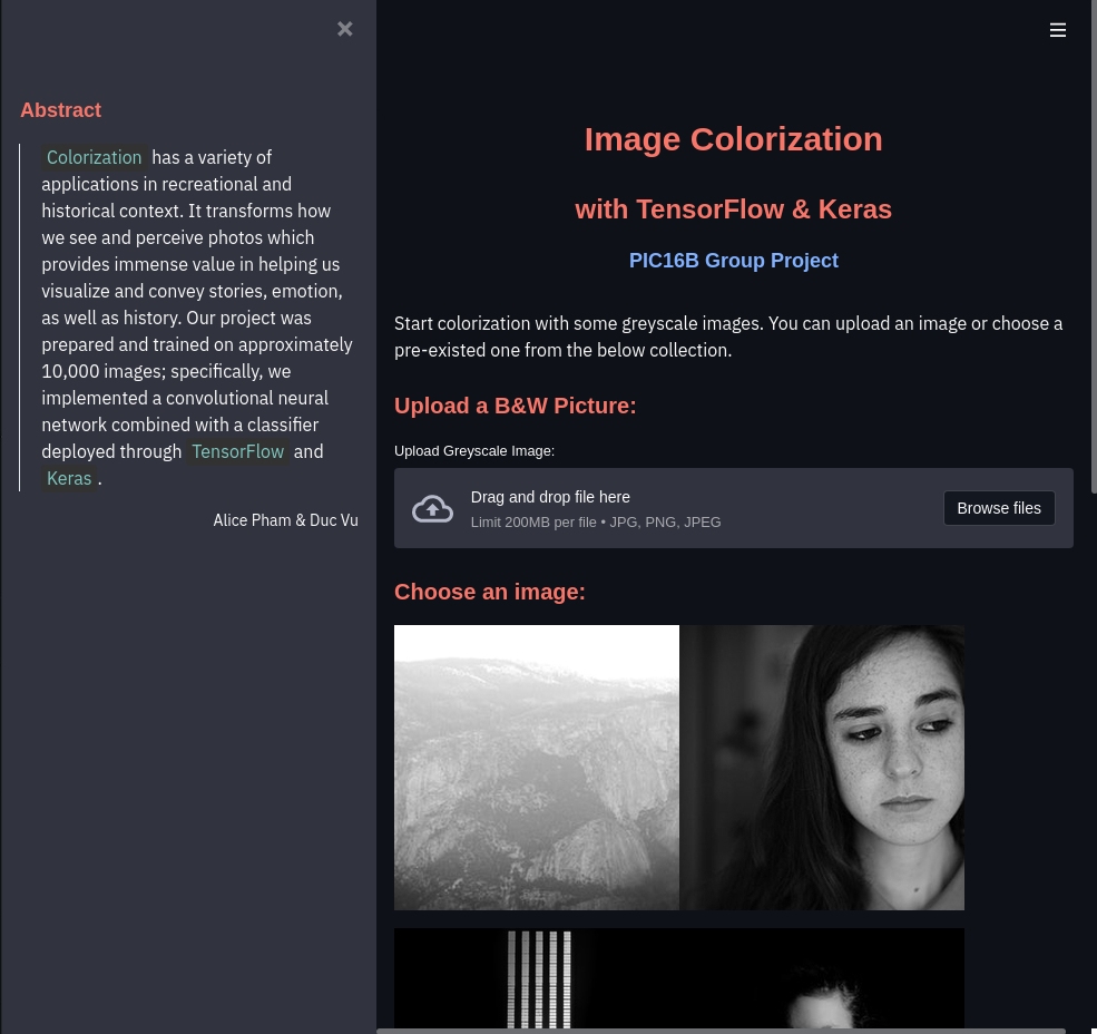 Looking back at the project proposal that we made two months ago, I am seriously amazed of how ambitious our group was during the time. We initially set up the bar quite high when aiming to train the model with roughly a million images, which in reality, we could afford to do so with only about 10k images. Furthermore, our ultimate goal is to build an interactive and fully functional webapp… We did indeed deploy a webapp on the internet, but it’s sadly just for look, and the users cannot really colorize any image with it. However, we did successfully create a Python local app as we proposed which we’re pretty proud of. Also, one of the aspects that we hope to achieve with this project is to be able to build a model that can predict and colorize historical photos with believable and “accurate” color tone/palette. Again, our model still has many flaws and needs to be undergone through a lot and lots more of training to be capable of carrying out such a task.